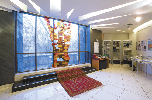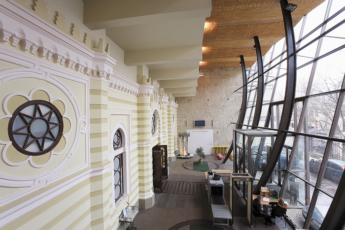 Тема новой архитектуры – вновь обретенное сокровище, и стеклянный фасад прикрывает его как витрина в музее – драгоценную реликвию. Если говорить о том, какой смысл заложен в архитектуру синагоги – то это прежде всего память – о том, что случилось с евреями в СССР в ХХ веке и что случилось с евреями в ХХ веке вообще. Это не только здание старой синагоги, взятой внутрь новой как в реликварий. Это и музейные экспозиции в башне, посвященные истории синагоги, истории общины и памяти погибших в ГУЛАГе. Это, наконец, и восточная стена молельного зала, эти квадры необработанного камня. Она напоминает другую стену из таких же необработанных камней, ту, к которой в 10.15 утра 7 июня 1967 года вышел спецназ полковника Мордехая Гура.