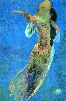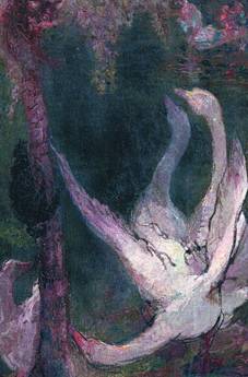 И вообще цветы, как их писал Люмкис, суть проявления более широкого – танцевального начала, пронизывающего весь его художественный мир. Речь не только о таких программных картинах, как «Танец» или «Танцы в поле». Вот «Поединок» – два всадника в экстатическом кружении. Вот «Разъяренный гусь» с балетно изогнутой шеей и раскинутыми крыльями на фоне своих более спокойных сородичей. Вот «Экстаз» – танцующая птица в ореоле красочных брызг. И наконец, «Качели», которые Любовь Агафонова (хозяйка галереи «Веллум», целенаправленно воскрешающая творчество забытых еврейских мастеров) назвала «самой жизнеутверждающей работой художника».