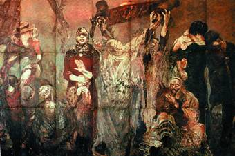 Было бы несправедливо утверждать, что монументальный дар Арона Люмкиса ушел в никуда. Да, без мастерской и нужных материалов, в коммунальной квартире невозможно было писать большие полотна. И тем не менее в 1960-х годах он задумал «Реквием» – картину, которая, по словам самого художника, стоила всего того, что он сделал. Он писал «Реквием» в своей комнате на стене, прибивая к ней картонные прямоугольники с наклеенным на них холстом. Из таких фрагментов и возникла эта картина, которую критики справедливо сравнивают с фресками: и писалась она на стене, а не на холсте, и сама техника письма предельно напоминает фреску, как бы расчищенную от поздних наслоений, возникшую почти из небытия.