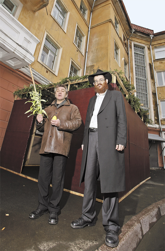 Раввин Довид де Брессер и председатель общины Илья Бондаренко около сукки.