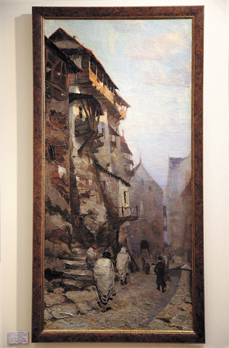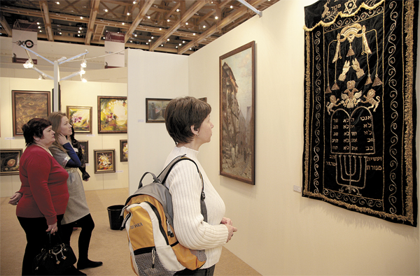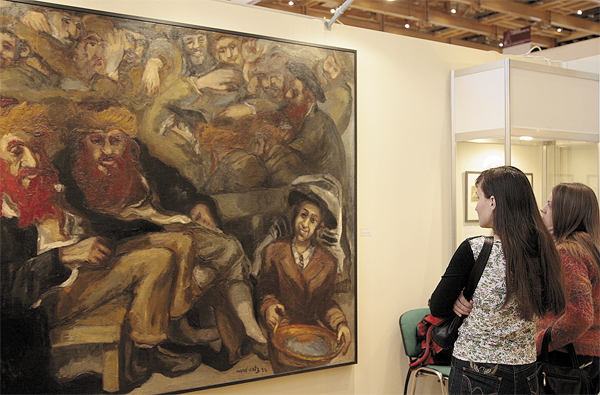 Но слева от входа – островок подлинности: небольшая выставка экспонатов из коллекции Российского еврейского музея (Музея толерантности). Перевязи для свитков Торы XVIII века, верхняя часть Арон Кодеш, ханукии, бсамим (сосуды для субботних благовоний), парохет (занавес для Арон Кодеш) и синагогальные подсвечники века XIX-го, несколько картин А. Лаховского, А. Марковича, Мане-Каца и ксилографии С. Юдовина XX столетия… Всего двадцать предметов. Об этой выставке уже рассказывал в прошлом номере журнала ее организатор и создатель коллекции музея Григорий Казовский.