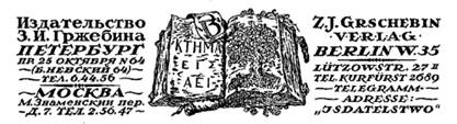 Следует отметить, что большая часть русских книгоиздательств и книготорговых фирм за рубежом была основана и принадлежала евреям. На первый взгляд это не столь заметно, так как евреи-предприниматели, наученные горьким российским опытом, предпочитали не давать лишнюю пищу антисемитам и скрывали свои весьма выразительные фамилии под звучными, но нейтральными названиями собственных фирм. Попытаемся, к примеру, определить родословную ряда берлинских издательств начала 20-х годов.