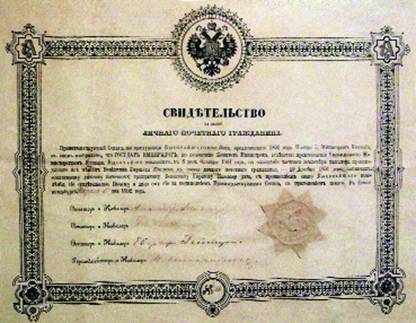 Свидетельство на звание личного почетного гражданина, выданное Вениамину Каплану в 1891 году.