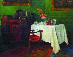 Столовая была не меньше залы, она отличалась только цветом обоев и своей обстановкой: большой буфет со стеклом и сервизами, керосиновая лампа над длинным столом, самоварный столик с медным огромным самоваром придавали комнате более будничный вид.