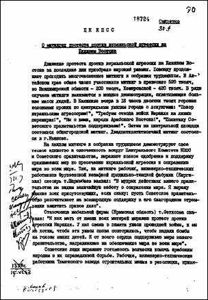 Движение протеста против израильской агрессии на Ближнем Востоке за последние дни приобрело широкий размах <…> В Алтайском крае общее число участников митингов превысило 520 тыс., во Владимирской области – 200 тыс., Кемеровской – 420 тыс. <…> Митинги выливаются в мощные демонстрации, охватывающие большие массы людей. В Калинине десятки тысяч горожан колоннами прошли по центральным улицам города с лозунгами: «Позор израильским агрессорам!», «Требуем отвода войск Израиля на линию перемирия!», «Политику Советского правительства поддерживаем!» Затем на центральной площади состоялся общегородской митинг. Двадцатипятитысячный митинг состоялся в г. Иванове. На каждом митинге и собрании трудящиеся демонстрируют свое тесное единство и сплоченность вокруг Центрального Комитета КПСС и Советского правительства, выражают полное одобрение и поддержку принимаемых мер по пресечению израильской агрессии <…> готовность всячески помочь арабским народам в их справедливой борьбе. Рабочие, инженерно-технические работники Тюменского завода строительных машин в резолюции, принятой на митинге, записали: «Берем на себя обязательство выполнить заказ Сирии по изготовлению продукции до 1 августа, а заказ Иордании – до 1 июля, что намного раньше срока» <…> В Приморском крае, Кемеровской, Харьковской, Ивановской, Владимирской областях и ряде других мест многие изъявляют желание, если потребуется, пойти добровольцами с оружием в руках защищать свободу арабских народов. <…> В этом они видят свой патриотический долг <…> Обстановка на местах деловая, спокойная. Каких-либо случаев паники, очередей за товарами первой необходимости не наблюдается. Партийные комитеты продолжают информировать о настроениях еврейской части населения. Как они сообщают, большинство лиц еврейской национальности придерживается правильных взглядов на происходящие события и вместе со всеми поддерживают политику и действия Советского правительства <…> Вместе с тем из партийных комитетов Белоруссии и Эстонии, Узбекистана, Казахстана поступили сообщения, что среди некоторой части еврейского населения проявляются сионистские настроения. Отдельные лица в личных беседах и даже публично одобрительно отзываются о действиях израильских агрессоров, выражают готовность сделать пожертвования в их пользу, огорчаются потерями израильских войск. В Нарвский горком КП Эстонии, например, 10 июня с. г. пришел рабочий Прибалтийской ГРЭС, еврей немецкого происхождения Иоффе с целью заявить, что считает действия Израиля справедливыми, т. к. Израиль строит социализм, и мы, мол, зря его не поддерживаем. Каких-либо нежелательных проявлений по отношению к лицам еврейской национальности со стороны населения на местах не наблюдается <…> Партийные комитеты <…> развертывают пропагандистскую работу <…> для показа сущности реакционной политики международного империализма на Ближнем Востоке <…>