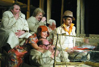 Впрочем, юдофобские куплеты – далеко не единственная находка Семеновского-Левитина. Творцы спектакля (включая, конечно, и художника – Гарри Гуммеля) крайне изобретательны и щедры на всевозможные прибамбасы и аттракционы. Это и Черное море, раскинувшееся в форме мелкого бассейна вокруг сцены, и лодки, в которые рассадили первые ряды партера, и интермедии в фойе: Паниковский выгуливает гуся, Козлевич кадит кадилом, санитары из дурдома ловят бухгалтера Берлагу, бомжеватого вида жители Вороньей слободки таскают у зрителей деньги.