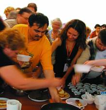 Рон Гершуни выглядит колоритно, как и должен смотреться шеф-повар, наделенный, помимо профессиональных достоинств, еще и способностями шоумена от кулинарии. Приоткрыв рот и высунув от усердия язык, он раскладывал и смешивал ингредиенты, делился собственными профессиональными наработками и отвечал на раздающиеся из зала «провокационные» вопросы: «почему вы стали поваром?», «кошерны ли принесенные продукты?», «что вы готовите любимой женщине?». Было весело. Пока Рон священнодействовал, поэт и журналист Юля Идлис работала «диск-жокеем», то бишь обеспечивала звукоряд: говорила о еврейской кухне как составной части национальной культуры и читала c экрана ноутбука цитаты из прозы Шолом-Алейхема, содержащие описания еды.
