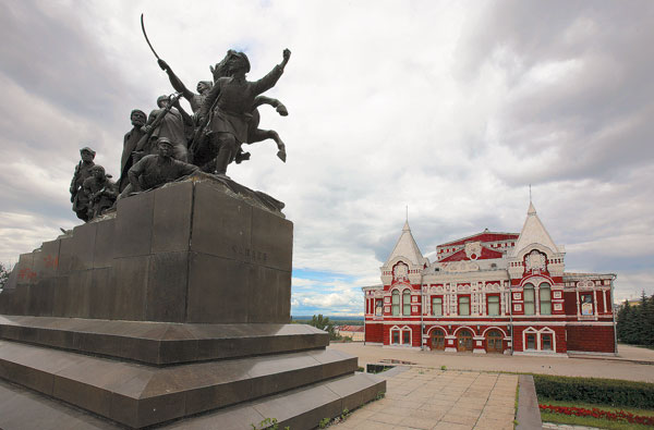 Михаил Абрамович показывает многофигурный памятник чапаевцам и находящийся неподалеку бункер Сталина. Здесь же, на высоком холме (или, как говорят волжане, «на юру́»), – великолепный старинный терем из красного кирпича, здание Самарского драмтеатра. В свое время в «Самарской газете» под псевдонимом Иегудиил Хламида публиковал рецензии на здешние спектакли Максим Горький. Наподобие этой: «Баритон вышел на сцену с грацией голодного верблюда и выпустил в зал унылое тремоло...»
