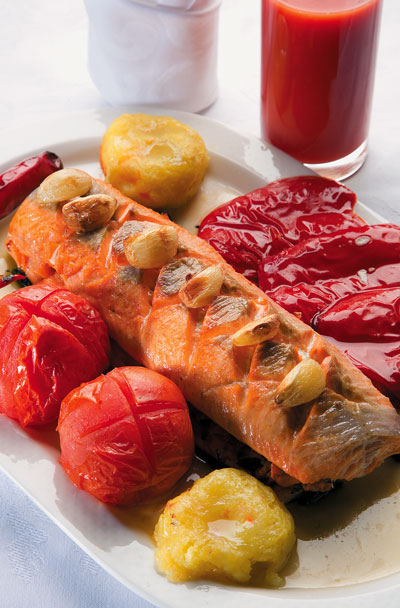 Наливаем в сковороду очищенное подсолнечное масло, нагреваем, выкладываем подготовленное филе, несколько помидоров черри, красный болгарский перец, горький перец, 2–3 зубца чеснока, по бокам от филе можно положить шарики, сделанные из картофельного пюре. Накрываем все это крышкой или фольгой. Запекаем при температуре 200 градусов в течение 15–20 минут. Затем даем остынуть 2–3 минуты и выкладываем на блюдо форель и гарнир из запеченных овощей. Порция форели на одного человека составляет 150–180 г.