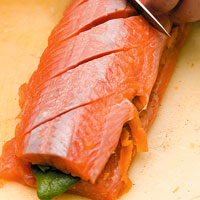 Берем форель, отделяем голову, разделяем вдоль линии хребта на две части, отделяем брюшко, центральную кость и все лучевые, полностью снимаем кожу. Солим, перчим обе части филе с двух сторон и пять-шесть минут выдерживаем в маринаде. Затем на один из кусочков филе выкладываем свежий мелкорубленый шпинат, на него – натертую свежую морковь (либо вареную, порезанную кружками) и на морковь – еще один слой шпината. Накрываем сверху вторым кусочком филе. Ножом делаем на верхней части филе фигурные надрезы.