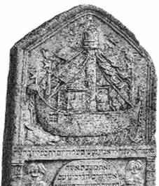 Один из наиболее интересных восточноевропейских надгробных памятников с изображением корабля – это надгробие Малки Бабад (1834) из г. Броды (Львовская область Украины). Текст эпитафии в переводе с иврита гласит[6]: