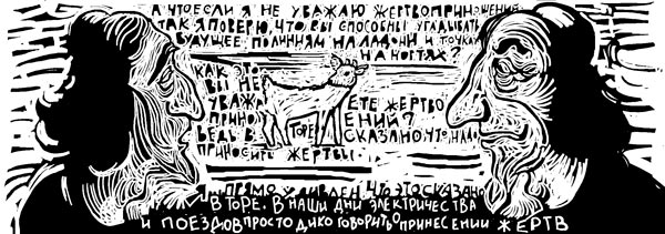 И вот после полуночи, буквально на ступенях молельни аскет реб Довид-Арон Гохгешталт полностью отвергает жертвоприношения. В прежние времена, говорит он, люди были кровожадными, дикими. Их тянуло колоть и резать. Так вот для того, чтобы евреи, подобно другим народам, не приносили жертв идолам, Тора повелела приносить скот в жертву Б-гу. Но в наши дни электричества и поездов просто дико говорить о принесении жертв.
