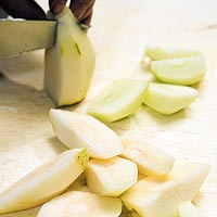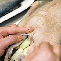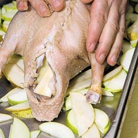 Вам понадобятся выпотрошенная с отделенной шеей, лапами и окончаниями крыльев тушка весом 2–2,5 кг, 0,5 кг яблок антоновка, 0,5 кг твердых груш, 50 г густого меда.