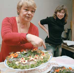 “За литературу” на этом шоу рассказывала писатель Мария Галина, не понаслышке знакомая с одесской кухней. Она читала собравшимся выдержки из прозы Бабеля, описавшего одесские застолья (помните: “Перекрытые бархатом столы вились по двору, как змеи…”), совершала экскурсы в историю Одессы, ее собственное ироническо-ностальгическое эссе о приготовлении баклажанной икры вызвало живой отклик зала. Кулинарную часть обеспечила шеф-повар этого мероприятия Татьяна Грекова, имеющая огромный опыт устройства праздничных банкетов и на практике владеющая массой “классических” еврейских рецептов, полученных от бабушки. На глазах у зала, делясь секретами, она приготовила и украсила несколько блюд, сопровождая процесс сентенциями своей мудрой бабушки (“Если ты устраиваешь праздник, уже от двери должен идти запах еды, чтобы гость, приближаясь, его чувствовал”), а затем сервировала целый праздничный стол закусками, салатами, принесенными загодя тремя вариантами гефилте-фиш и штруделем на десерт. Непрерывно, чередуя теорию с практикой, духовную пищу с пищей из духовки, М. Галина и Т. Грекова занимали внимание зрителей, которые чутко внимали, жадно следили и сглатывали слюнки. Приготовлено было столько, что попробовать и оценить удалось каждому.
