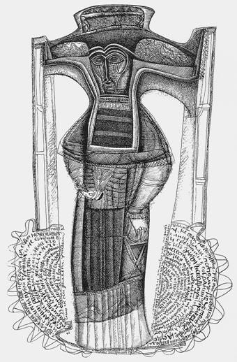 Впрочем, меньше всего работы Шварцмана напоминают детские рисунки или спонтанное рисование. Даже портрет обычного человека (например, «Сережи», 1972) на листе Шварцмана начинает обретать вдруг очертания и монументальность египетского сфинкса. Что уж говорить об изображении царя Давида, опирающегося на полукружья, исписанные изречениями? Его фигура похожа на статую и одновременно – иероглиф, вбирающий в себя текст псалмов… Многие иературы построены как симметричные развернутые изображения, напоминающие маски первобытных племен Северной Америки, Китая, Сибири, Новой Зеландии… Иначе говоря, художник охотно использует опыт архаических культур. Собственно, после поисков кубистов, интереса Пикассо к африканским маскам, после Гогена, воспевшего таитянский рай, увлечением архаикой трудно кого-то удивить.