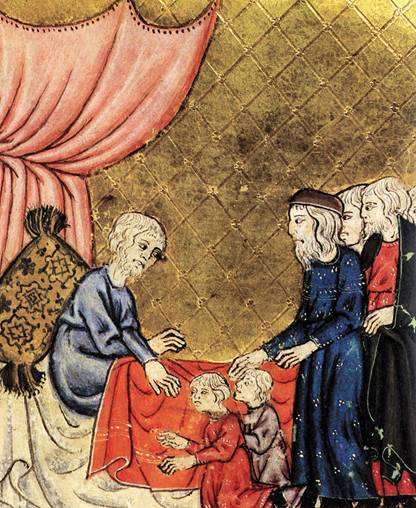 Умирающий Яаков благословляет Эфраима и Менаше, детей Йосефа. Иллюстрация из Золотой Агады. Испания. XIV век