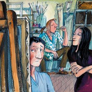 Деннис слоняется по мастерской, хватает тюбики с краской – выжмет каплю на руку и оботрет о джинсы.