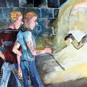 Мы уже собираемся уйти (sans[8] флага), как слышим стон. Доносится он, судя по всему, из-за труб органа. Тяжкий мужской стон. Мы забираемся на хоры и обнаруживаем там сторожа. Лицо у него побитое, в синяках, под каждой ноздрей полумесяцем – полузасохшая кровь.