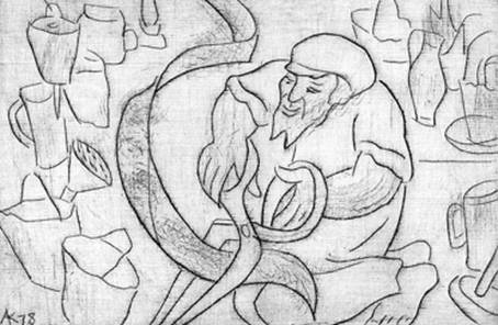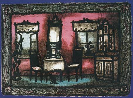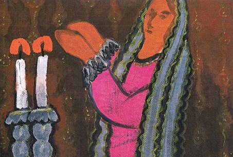 Вновь и вновь Каплан возвращается к теме влюбленных. Каждый раз это другая, но все та же история любви. Мужчина и женщина: то они держатся за руки, то обнимаются, то разговаривают – и в карандашных рисунках, и в литографиях, и в исполненных разнообразными красками работах, и в керамике, которую он освоил уже в весьма солидном возрасте. Акцент, который делает Анатолий Каплан, – это всегда взаимодействие, беседа между образами. Это могут быть и два стула («Комната», 1966–1967), и пара животных (еврейская народная сказка «Козочка», 1961). На них работает вся картина: каждая ветка, птица, дом, шкаф – неслучайны. Каждая свеча в праздник горит столько, сколько нужно («Субботняя молитва», 1967).