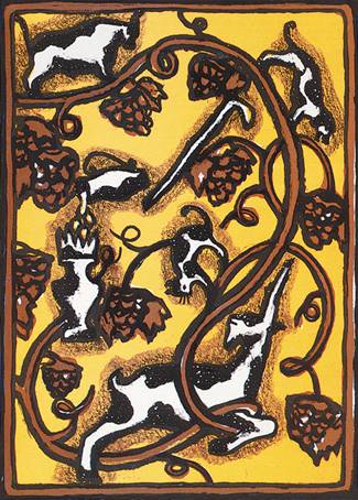 Подобное взаимодействие двух фигур создает правильное напряжение и ритм, на котором держится вся работа. Искусство Каплана – это синтез очень разных традиций: интенсивный открытый цвет как у Матисса, струящиеся фигуры, напоминающие Модильяни, средиземноморская чувственность и при этом чисто еврейская лаконичность, где деталей немного, но они рельефны, цвет – радостный, а форма – проста. Орнаментальность во многом свойственна Анатолию Каплану как графику. Также бросается в глаза одна его характерная особенность: использование слова, чаще фразы по рамке картинки. Это не случайность, если подумать о Торе. Тора есть слово, а слово задает рамку этого мира. Мир осуществляется словом. Каплан же просто напоминает об этом.