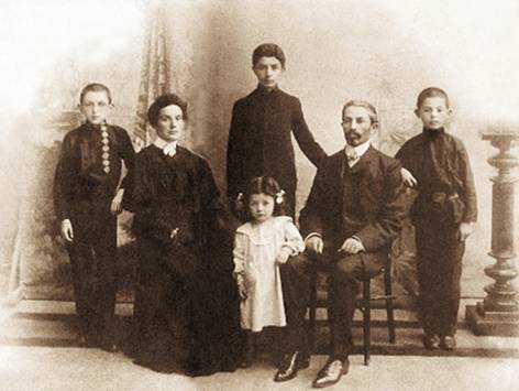 Слева направо: сын Михаил, мать Миндель Ароновна, сын Александр (будущий Фазини), отец Арье Беньяминович, сын Илья (будущий Ильф), (в центре внизу) сын Вениамин.