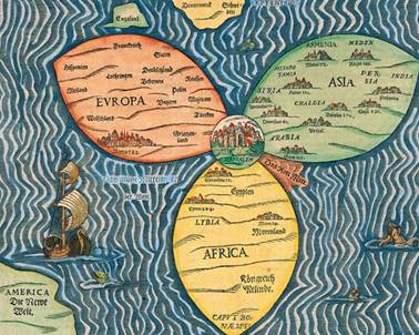 Добавим к этому, что на картах Средневековья мир показан в виде круга‚ в центре которого находится Иерусалим, а на карте 1581 года, созданной Г. Бюнтингом в Германии, Земля изображена в виде трилистника‚ омываемого морями. Лепестки трилистника – Европа‚ Азия‚ Африка; сбоку‚ за морями‚ видна Америка, но в центре трилистника – Иерусалим.