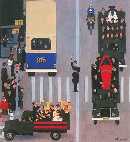 Ладыженский не был только сумрачным певцом замогильных тем. Его замечательные «Похороны председателя колхоза» на том же кладбище выдают остроумие художника. В самом центре колхозной похоронной процессии, среди массы людей с непокрытыми головами, мы видим бородатое лицо, чуть ли не в хасидской черной шляпе, на ярко-белом фоне венка.
