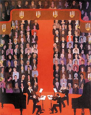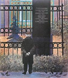 Еще более ясно это становится при сравнении двух работ, которые находятся в разных альбомах художника. Это упоминавшийся уже «Концерт Шуберта» и «Все смертны» из цикла «Люблинское кладбище в Москве». Здесь концертный зал одной картины просто оказывается «обращен» в кладбищенские ряды другой. Не будем специально анализировать откровенно еврейские лица слушающих музыку Шуберта и покойников, с высокой степенью вероятности отправившихся на нееврейское кладбище под нееврейский похоронный марш. Да еще на Люблинское кладбище, где есть специальный участок для умерших в советском госпитале немецких военнопленных – прямых виновников уничтожения того еврейского мира, о котором размышляет Ефим Ладыженский. Картин такого рода мы у него не видели. Поэтому нельзя сопоставлять его «Люблинское кладбище» с нашими собственными впечатлениями, но отрешиться от них трудно.