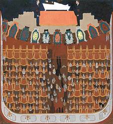 Однако никому еще, кажется, не приходило в голову так изображать портовых одесских грузчиков и биндюжников, не говоря уже о портных и рыночных торговках. И тут бросается в глаза картина, на которой изображены похороны двух солдат («По приказу родины»). Тот факт, что они «плоско» лежат на спинах в гробах, вполне закономерен. А вот то, что почетный караул «лежит» справа и слева как бы на «клапанах» разверстой могилы, заставляет задуматься – не след ли это многолетней работы Ладыженского в театре, искусстве, где открытая перед зрителем «четвертая стена» оказалась... разверстой могилой. Ведь к моменту отъезда и уничтожения своих работ Ладыженский уже давно в театре не работал. Не стала ли оставленная сцена, на которой художник оформлял один спектакль за другим, образом той сцены жизни, последняя картина которой – всегда разверстый параллелепипед, на который смотрят сверху. И «супрематическому» натурализму плоского квадрата и прямоугольника здесь препятствует осыпь краев земельной геометрической фигуры с прямыми углами в плане и двойная трапециевидность в «фас» того предмета, в который ложатся «как скрипка в футляр» и который сам должен лечь в могилу.