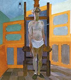 Однако веселье кончается на израильских картинах из серии «Вечный жид». На центральной, по-видимому, картине цикла «Я в Иерусалиме» не только сам художник «распят» на ее крестообразной композиции, но и упоминавшийся выше «Концерт Шуберта» жестко противопоставлен по диагонали слева направо еврейским похоронам. Однако от примитивных христианских коннотаций картину спасает замечательный жест художника, держащего в левой руке палитру, которая выглядит как сорванная со своего традиционного в христианском искусстве места над головой распятого, где обозначено, что он и есть «Царь Иудейский». Ладыженский распят не столько на кресте, сколько на крестовинах растяжек холста, видных лишь в том случае, если повернуть холст изображением к стене. И именно на фоне таких крестовин изобразил себя художник (на картине из той же серии «Я в Рамоте») в виде святого Себастьяна, который, как известно, был привязан к дереву и пронзен массой стрел. Ладыженскому хватило одной стрелы: той, что направлена в сердце. И рана эта связана с холстами, повернутыми к стене, и их крестовинами. А множественность стрел классического св. Себастьяна заменяет множественность крестовин молчащих и повернутых к стене холстов.