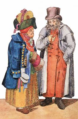 Торговка и еврей. Иллюстрация из издания «Волшебный фонарь, или Зрелище С.-Петербургских расхожих продавцов, мастеров и других простонародных промышленников, изображенных верною кистию в настоящем их наряде и представленных разговаривающими друг с другом, соответственно каждому лицу и званию. Ежемесячное издание на 1817 год».
