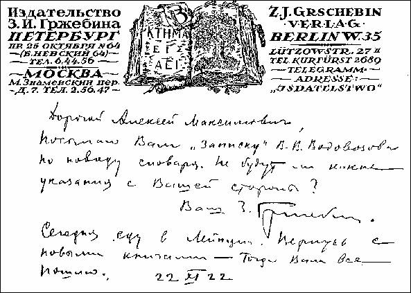 Письмо З. Гржебина к М. Горькому от 22 ноября 1922 года