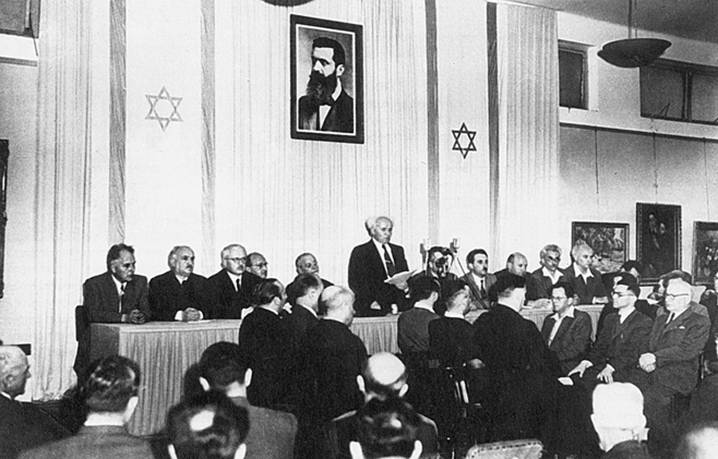 5 ияра 5708 (14 мая 1948) года Давид Бен-Гурион в Тель-Авиве провозглашает создание Государства Израиль