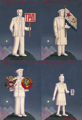 Наконец, если поиск визуального кода для «Алефбета» вел к текстам прошлого, к истории, то серийные фигуры «Фундаментального лексикона» – в противогазах и с автоматами, а кто с книжкой и с линейкой, оказывающие первую помощь и выступающие на собрании, марширующие и крадущиеся к врагу – были отрезаны от истории и законсервированы в настоящем. Они не вели в глубину традиции, а воспроизводили штамп. Эти персонажи не ведали о третьем измерении – их мир был двухмерным, как плоскость плаката. Только благодаря художнику они превращались в «монумент момента».