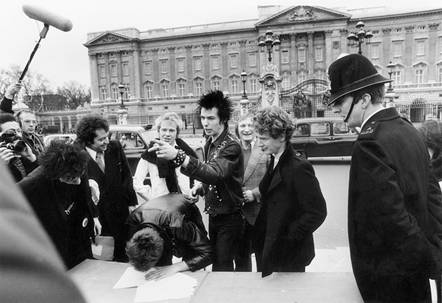 Музыканты «Sex Pistols» вместе со своим менеджером Малькольмом Маклареном на фоне Букингемского дворца подписывают соглашение с «A&M Records» после того, как был разорван контракт с «EMI».  Лондон. 10 марта 1977 года