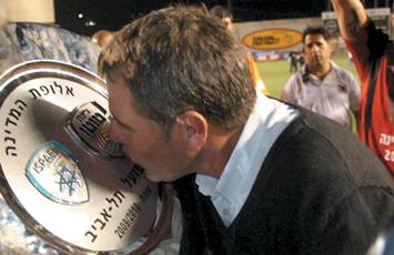 Тренер «А-Поэля» Эли Гутман целует главный трофей чемпионата Израиля по футболу. Иерусалим. 15 мая 2010 года