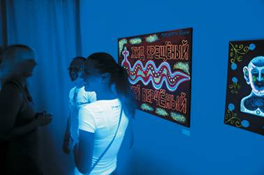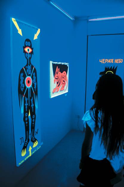 И не софистические игры с идеями Беньямина более всего привлекли нас в темном зале, где из черных стен в полном соответствии с законами зрительного восприятия агрессивно выступали светящиеся подобия картин Гробмана от послегагаринского 1962-го до предшествующего выставке 2009 года.