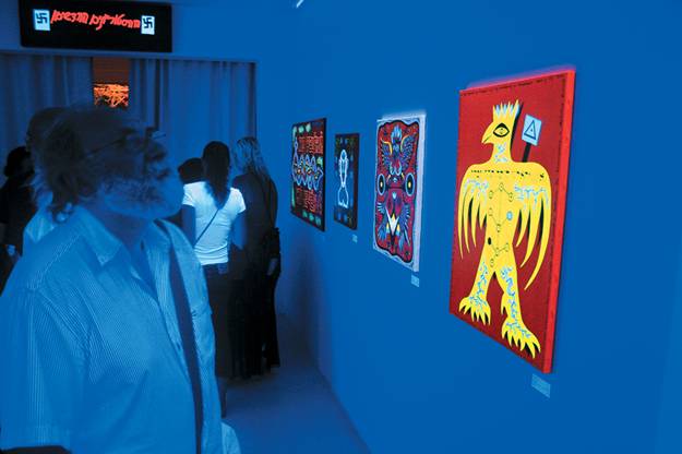 Группа молодых израильских художников сознательно создала непростую, постоянно множащуюся структуру: художник Михаил Гробман, чьи произведения отсутствуют на выставке / куратор Руфина Вальски / картины «Михаила Гробмана», перерисованные красками, светящимися при ультрафиолетовом освещении / «Kollektiv» – «кураторский проект четырех художников: Зои Черкасской, Андрея Льва, Анны Лукашевской и Макса Ломберга», как сказано в их англо-иврито-русском манифесте.