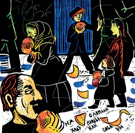 Тетя Фейга накрывает шалахмонес салфеткой и отдает посыльному. Апельсин высовывает макушку из-под салфетки, как будто говорит: «Я тут, весь целиком, с праздником, дети!» Дети провожают его в путешествие тоскующими взглядами. Они знают, что ему, бедному, предстоит выдержать много перевоплощений, прежде чем он вместе с посыльным вернется обратно.