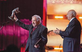 Лауреат в номинации «Человек-легенда» Петр Тодоровский получает премию от лауреата премии ФЕОР «Человек года – 5765» народного артиста России Владимира Этуша