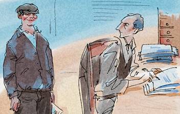 Он придвинул старый деревянный стул, чтобы я сел. Я отказался, и тогда он уселся сам, раскинув ляжки, скрестив руки, изготовясь для изящной беседы.