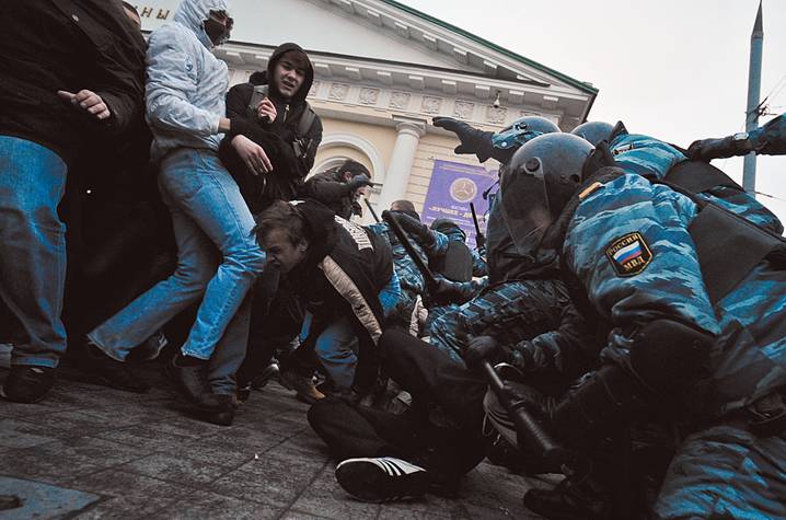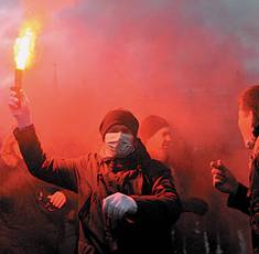Группировки футбольных болельщиков во время беспорядков на Манежной площади поджигают файеры, запрещенные на трибунах, и сопротивляются ОМОНу. 11 декабря 2010 года