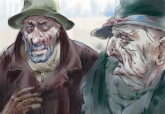 Он показал мне спину — жутко трясущуюся спину — и засеменил прочь. Хоть и скукоженный, он сохранил приличный рост, но был в каких-то поразительных лохмотьях. Одежка на нем висела, болталась, стреноживала ему шаг; однако что-то неясно посверкивало на лодыжке. Я чуть ли не подумал, что это старинное женское белье, которое носили семьдесят лет тому назад. И он был в старинных женских туфлях на высоких тонких каблуках — как колышки такие. Я припустил за ним — хожу я довольно бодро, учитывая мой возраст, — и как следует оглядел его лицо. Кошмарная картина. При нем был красный стек — по-видимому, оголенный дамский зонтик (теперь уже таких приспособлений никто не знает), — и он на меня им замахнулся.