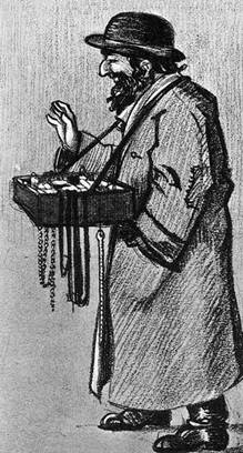 Мастерство коробейника достигается упражнением. Самое верное дело — завернуть к Пиоватти, ближе к вечеру, когда состоятельные господа кушают кошерные сосиски с хреном. Чтобы не уронить лицо фирмы, еврей-хозяин обязан угостить еврея-разносчика тарелкой супа. Вот он уже немного и заработал. А что касается едоков, то они на сытый желудок впадают в очень филантропическое настроение. Ни в ком доброта так глубоко не связана с физическим удовольствием, как в еврейском торговце. Ежели он поел, поел от души, он даже способен купить подтяжки, хотя держит точно такие же у себя в лавке. Скорей всего, правда, он ничего не купит, но подаст коробейнику милостыню.