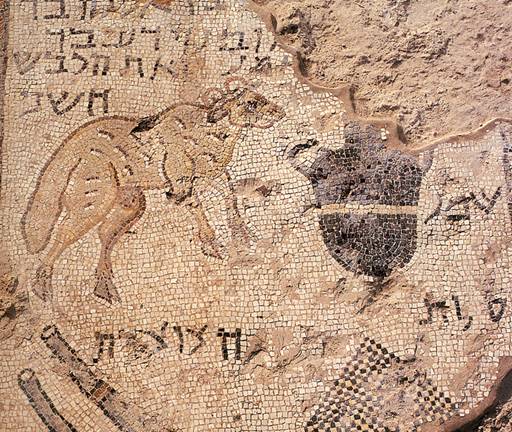 «Подведи теленка к Шатру Встречи, и пусть Аарон и его сыновья возложат руки на голову этого теленка. Зарежь теленка пред Г-сподом у входа в Шатер Встречи. Возьми кровь теленка и нанеси ее пальцем на выступы по углам жертвенника» (Шмот, 29:10-12). Фрагмент мозаики из синагоги в Ципори. V векн.э.