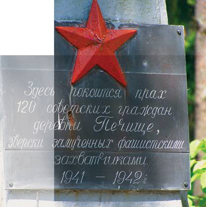 Три года назад я впервые побывал в Белоруссии, в деревне Печищи, недалеко от Паричей и Бобруйска, в поисках могилы деда. Скоро я снова отправлюсь в те места, чтобы убедиться в том, что имя деда указано на памятнике братской могилы, где захоронены более тысячи советских солдат. И снова приду на местное кладбище, где находится ухоженная могила: металлическая стела с пятиконечной звездой и табличкой: «120 советским гражданам, зверски замученным гитлеровцами в 1941–1942 гг.». Очевидно, на этой могиле должна быть другая надпись и другая звезда. В центре таблички — вмятина от срикошетившей пули вандала.
