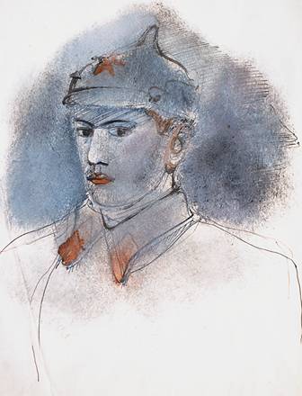 Можно понять мрачное недовольство Штеренберга. Сумасшедший талантливый мальчишка, вместо того, чтобы учиться, лезет в самое пекло войны. Трудно отделаться от мысли, что образцом для подражания для Лабаса были не только «футурист» Маяковский, но прежде всего собственный старший брат, музыкант Абрам Лабас, который во время Гражданской стал комбригом и командовал на Дальнем Востоке одним из легендарных корпусов, которые дошли до Спасска и Волочаевки. В 1937-м комбрига Лабаса, заместителя начштаба Киевского военного округа, расстреляют. А в 1932-м его брат нарисует его портрет — черноокого красавца в буденовке со звездой. Никаких бытовых деталей. Тем более никакого намека на жестокость войны. Из мягкого светло-серого фона выступает нежное лицо музыканта, который стал воином. Это, конечно, не Давид, который вышел сражаться с Голиафом, но образ, по интонации ему близкий. Любопытно, что библейский образ отважного певца, чувствующего зов истории и стремящегося откликнуться на него, по-видимому, близок и младшему брату.