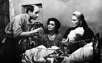 Сцена из фильма «Комиссар», снятого режиссером Александром Аскольдовым по мотивам рассказа Василия Гроссмана «В городе Бердичеве». Ролан Быков в роли Ефима Магазаника; Нонна Мордюкова в роли комиссара Клавдии Вавиловой; Раиса Недашковская в роли Марии Магазаник. 1967 год