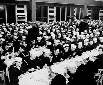 Курсанты военно-морской базы на Великих Озерах празднуют пасхальный седер во время второй мировой войны. Собрание еврейских архивов. Чикаго