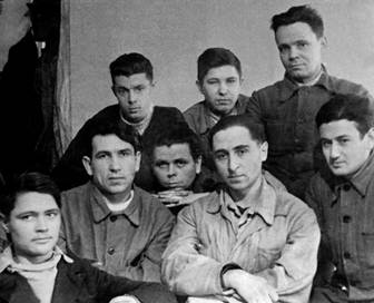 Леонид Шварцман (второй справа в нижнем ряду) среди рабочих Челябинского тракторного завода. 1943 год